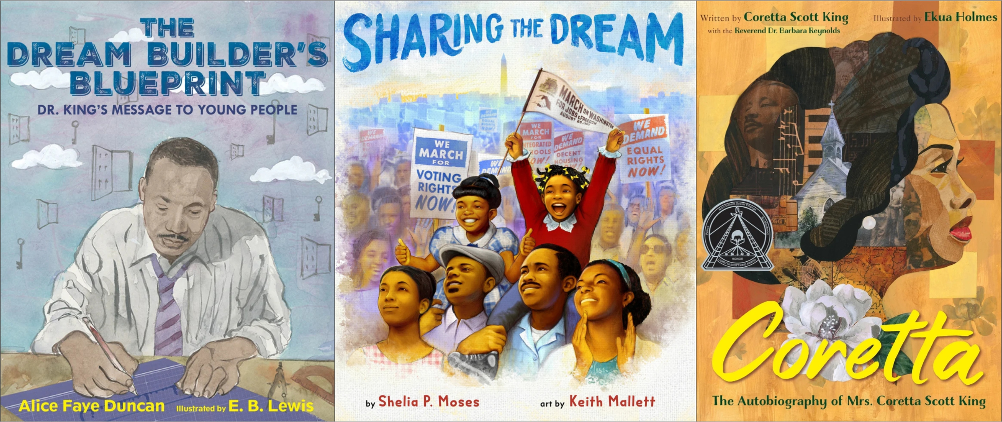 In Sharing the Dream (Nancy Paulsen Book, 2025), Shelia P. Moses and Keith Mallett collaborate on a historical fiction story about a young girl inspired by King’s dream for children all over the world. Alice Faye Duncan (Coretta’s Journey and Memphis, Martin, and the Mountaintop) returns with another poetry offering in remembrance of King. In The Dream Builder’s Blueprint: Dr. King’s Message to Young People (Calkins Creek, 2026), Duncan “reinterprets King’s speech as a motivational erasure poem…accompanied by spirited and inspired art by Philadelphia-born illustrator E. B. Lewis.” Some memories included in the picture books are personal narratives from loved ones of Martin Luther King Jr.